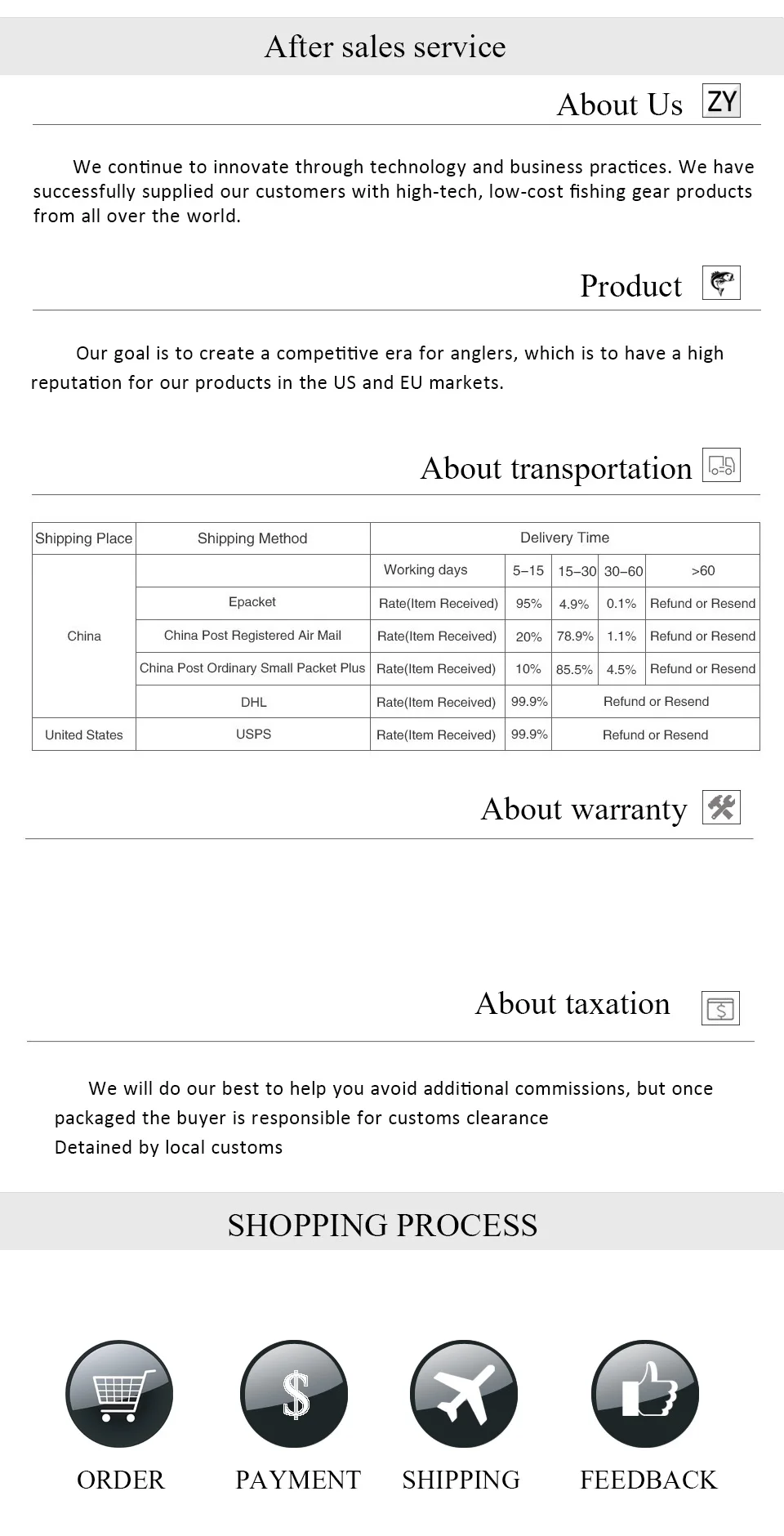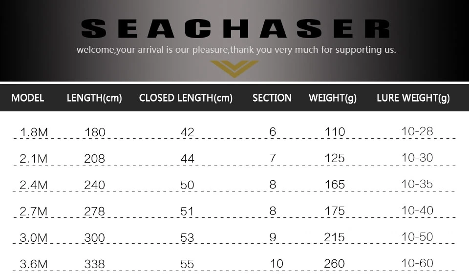 - Longueur : 180 cm / Longueur fermée : 42 cm / Section : 6 / Poids : 110 g / Poids du leurre : 10-28 g 2.1M---- Longueur : 208 cm / Longueur fermée : 44 cm / Section : 7 / Poids : 125 g / Poids du leurre : 10-30 g 2.4M---- Longueur : 240 cm / Longueur fermée : 50 cm / Section : 8 / Poids : 165 g / Poids du leurre : 10-35 g 2.7M---- Longueur : 278 cm / Longueur fermée : 51 cm / Section : 8 / Poids : 175 g / Poids du leurre : 10-40 g 3.0M---- Longueur : 300 cm / Longueur fermée : 53 cm / Section : 9 / Poids : 215 g / Poids du leurre : 10-50 g 3.6M---- Longueur : 338 cm / Longueur fermée : 55 cm / Section : 10/ Poids : 260 g / Poids du leurre : 10-60 g Description: 1,8 M, 2,1 M, 2,4 M, 2,7 M, 3,0 M, 3,6 M sont juste un modèle, pas la longueur réelle.